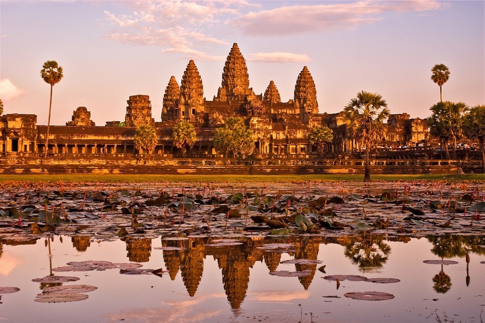 Experience the enchanting beauty of Angkor Wat at sunset, where the temple is bathed in warm, golden light