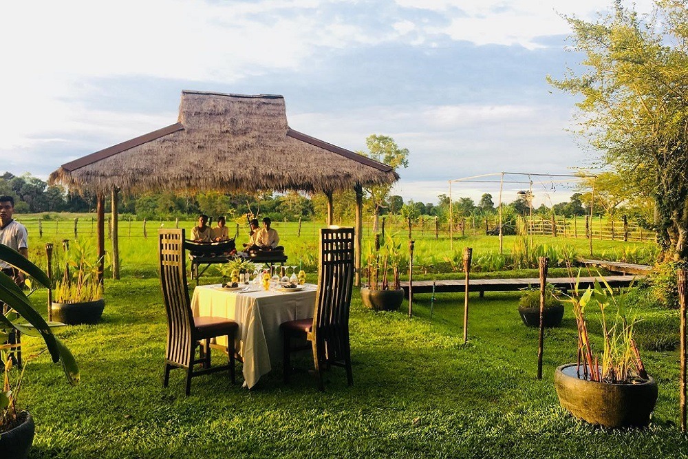 Villa Chandara, a classic Khmer-style villa nestled in a village near Siem Reap, is surrounded by picturesque rice paddies and spice gardens. Immerse yourself in local culture with a ride in an ox cart through the village, a leisurely bicycle ride, or a short trip in a 1960s jeep to an ancient Angkorian bridge. Before dinner, wander through our spice gardens to select fresh herbs for crafting your cocktail, enjoy a soothing foot massage amidst the tranquil rice paddies, and catch the sunset with a glass of Prosecco as you stroll through the terraces or relax in a secluded pergola with a scenic view. As the sun dips below the horizon, hundreds of candles and lanterns light up, creating an enchanting ambiance. The evening culminates in a special five-course Khmer dinner, accompanied by unlimited wine, beer, and soft drinks, all while being serenaded by live traditional music.